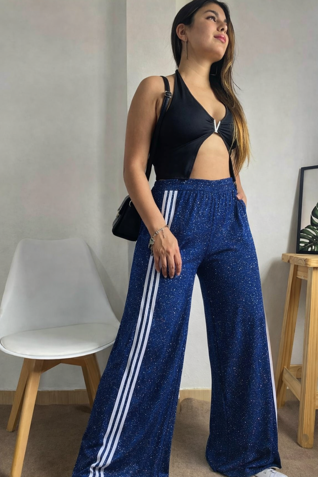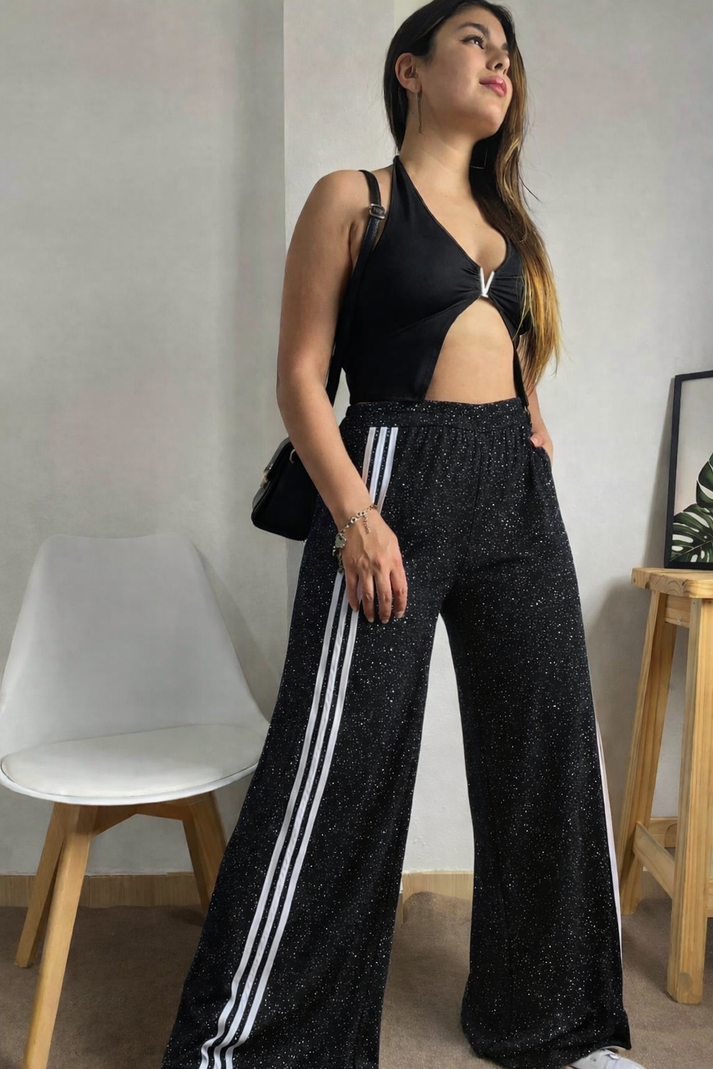 Palazzo de caída fluida y brillo sutil. Cómodo, elegante y fácil de combinar. No marca y acompaña el movimiento del cuerpo.